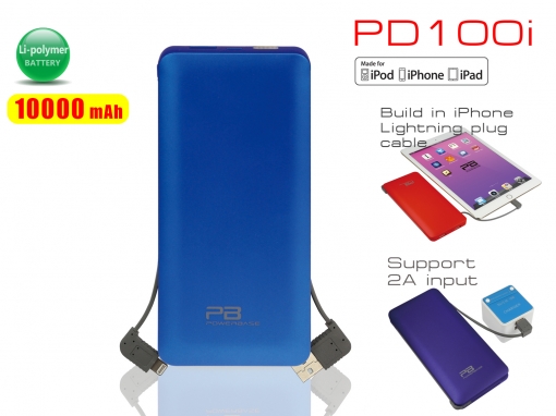 | Battery type | Li-polymer | | Capacity | 10000 mAh | | Input | 5V2A | | Output 1 | 5V1A | | Output 2 | 5V2.1A | | Charge time | 5-6 hours | | Dimensions | 73 x 152 x 16mm | | Weight | 220 g | | Indicator | 4 LED | | Special function | Build-in USB and iPhone Lightning plug cable |